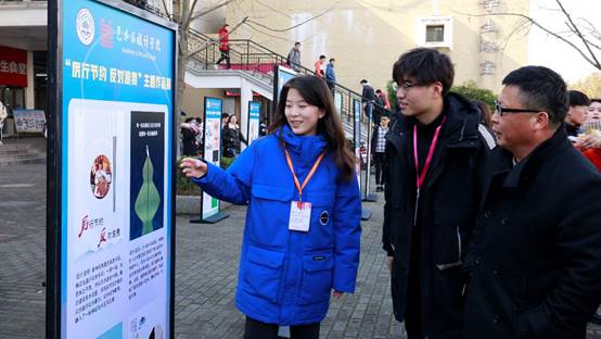 自2020年11月发布征稿以来,活动获得了广大师生的高度关注和热情回应,共收到100余件作品,经评审,共选出48件优秀作品进行展出。作品入选此次展览的郭洋洋同学谈到“很高兴我的作品能入选此次展出,作为一名艺术生,能够发挥专业特长引领文明节约新风尚,我感到非常荣幸,同时我也希望自己的作品能够影响和带动更多同学从身边点滴做起,自觉杜绝浪费行为。”参观展览的2020级环境设计专业学生顾延昊谈到“展览中的海报作品无一不展现着‘厉行节约,反对浪费’的理念,尤其是以树木为题材的作品‘到底还能抽多久’令我印象深刻,它由被砍伐的树木、纸张和草丛组成,告诫我们应该保护资源、勤俭节约、杜绝浪费。”他表示这次作品展对他启发很大,自己今后会继续努力,学习运用专业技能去宣传推广社会风尚,在做好自身的同时也引导他人勤俭节约,让节约之风在校园中盛行。