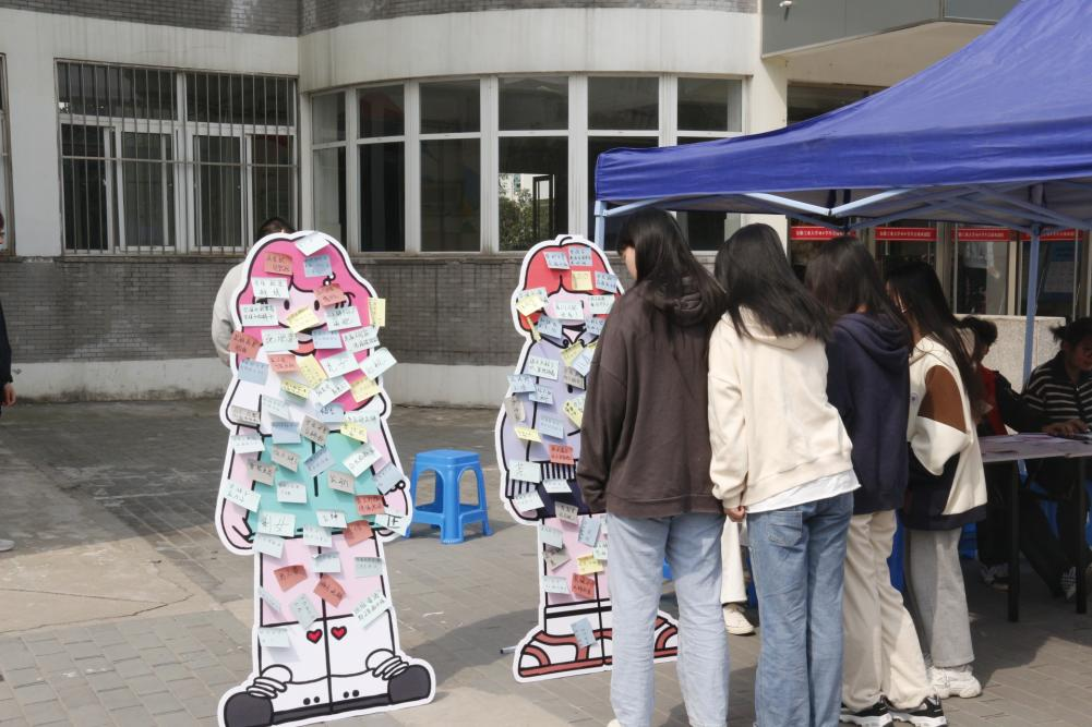 心理协会准备了两个人形立牌,贴满了由便利贴做成的各种“标签”,代表着社会中对男性、女性不同的性格标签、气质标签、刻板印象标签及带有社会规训的话语标签。参与活动的同学来到活动现场,仔细找到标签,先撕下人形立牌上的标签,以此来舒缓内心的压力,接着在便利贴上写着对未来的展望、美好的祝福,再将便利贴贴回人形立牌。