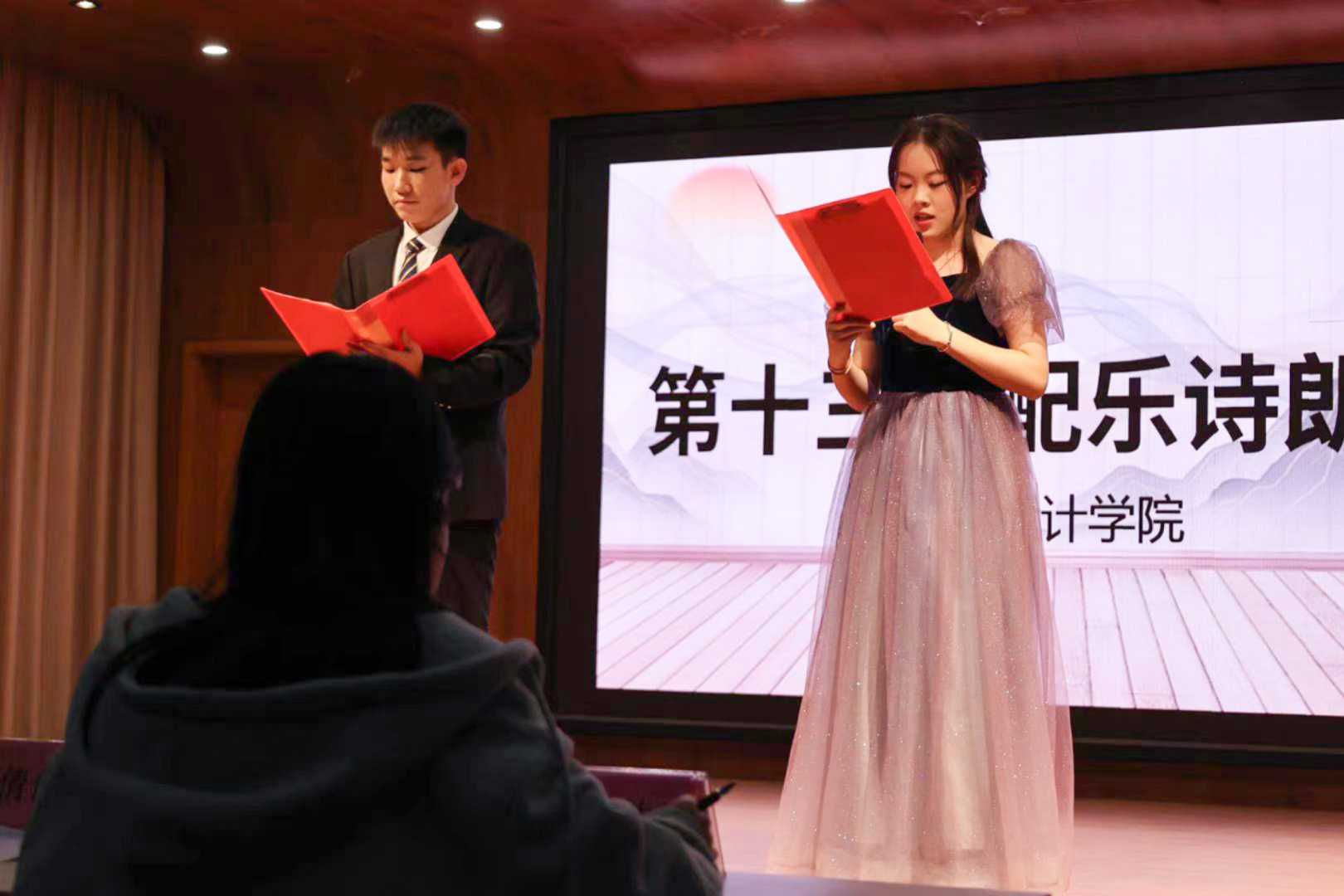 于艺设楼401举办配乐诗朗诵比赛。2021级辅导员罗凡,2023级辅导员王倩倩及各部门负责人出席此次活动并担任评委,部分学生代表观看比赛。