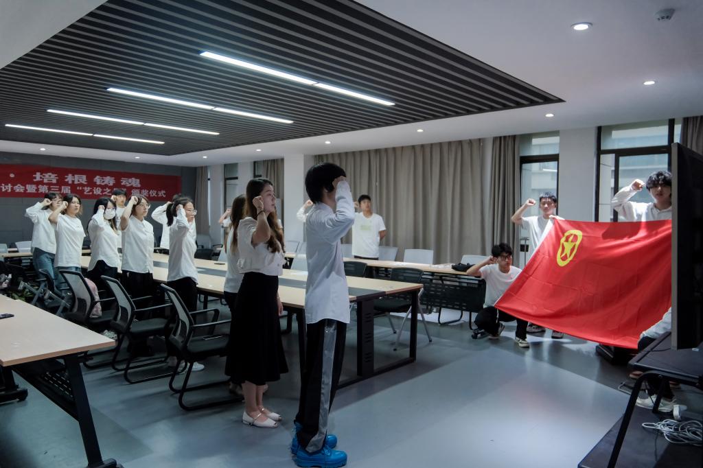 团委共有25名先进青年被发展入团。团徽是中国共青团的象征和标志,罗凡和优秀团员代表共同为新团员颁发团徽徽章。随后,全体新发展团员在新发展团员代表黄孝楠的带领下,举起右拳,面向团旗庄严宣誓。