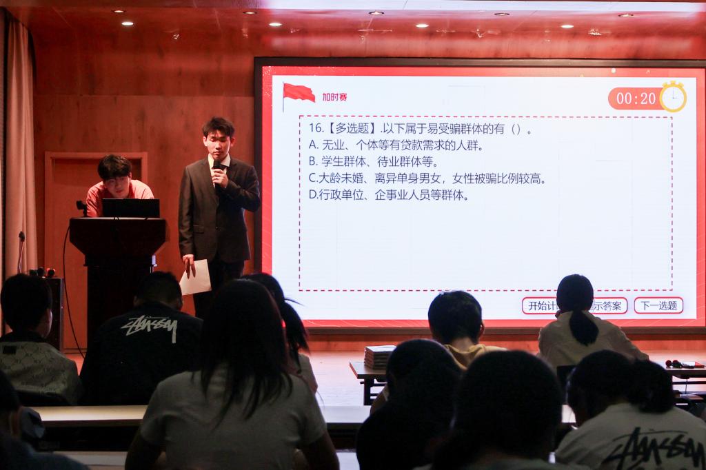 随着主持人的提示,比赛正式开始,选手们迅速地回答着屏幕上出现的问题。舞台下,观众聚精会神地观看着比赛,时不时为选手们的精彩表现鼓掌。随着比赛的进行,一些选手逐渐展现出他们对反诈知识的深刻理解,而其他选手则在一些难题面前显得有些吃力。评委们认真地记录着每位选手的表现,不时地点头或交换意见。比赛最后,设233班团支部荣获第一名,境233班团支部荣获第二名,媒体231班团支部荣获第三名,视231班团支部与境221班团支部并列第四名。