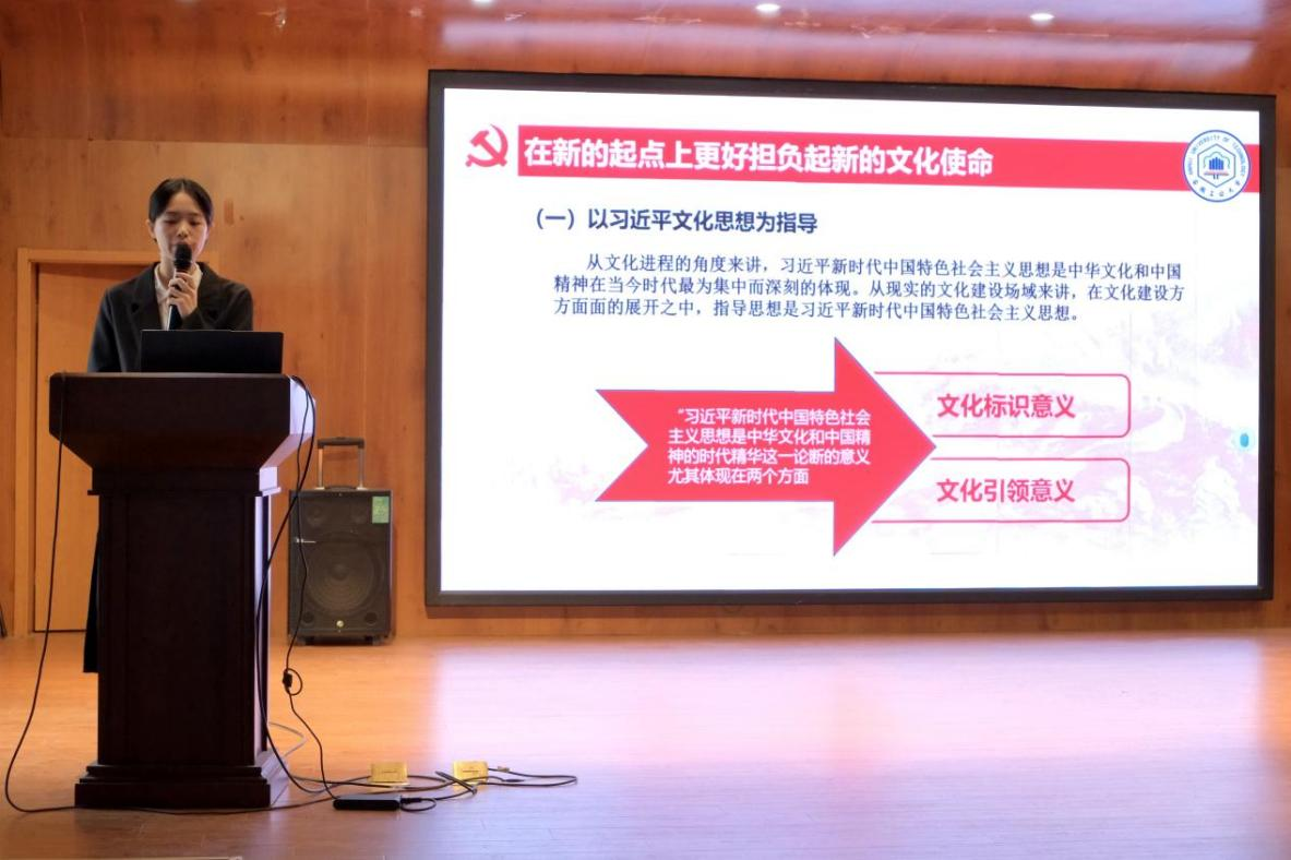 最后,宣讲团成员乐月以“践行习近平文化思想,青春筑梦”为主题,分享了自己对全会精神在文化艺术领域的理解和实践。她指出,作为新时代的艺术与设计教育工作者,我们要以习近平文化思想为指导,坚定文化自信,秉持开放包容的态度,坚持守正创新的原则,为传承和弘扬中华优秀传统文化、推动文化艺术事业繁荣发展贡献自己的力量。