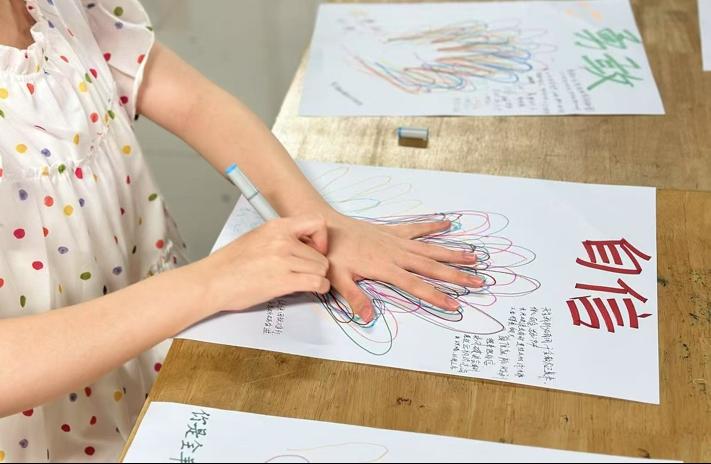 活动设置的“掌印绘心”环节中,现场准备了印有“坚持”“勇敢”“自信”等正能量词汇的模板。同学们用彩笔描摹手掌轮廓,在掌心书写近期心愿或烦恼:有同学写下“愿保持热爱”的期许,也有同学抒发“突破瓶颈”的决心。现场展示的手掌作品中,一幅以“天行健,君子以自强不息”为内容的创作吸引关注,刚劲的字迹搭配深色笔触,传递出坚韧的力量感;另一幅画有笑脸图案的掌心写下“心想事成”,明快的色彩让观者感受到积极的情绪。