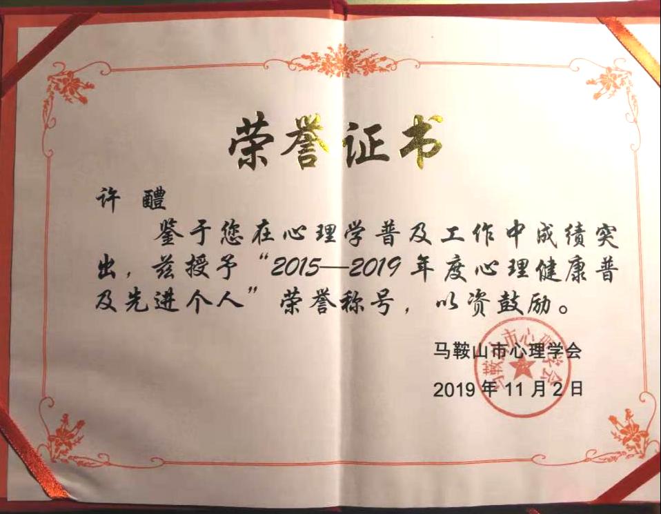 还荣获安徽省2018-2019年度心理健康普及工作先进集体,是全省先进集体中唯一一个院系单位。院心理工作站站长许醴老师也被马鞍山心理学会授予了“心理健康普及先进个人”荣誉称号。今后工作站将再接再厉,进一步加强工作创新,面向全院学生,全方位全角度开展心理健康教育工作。