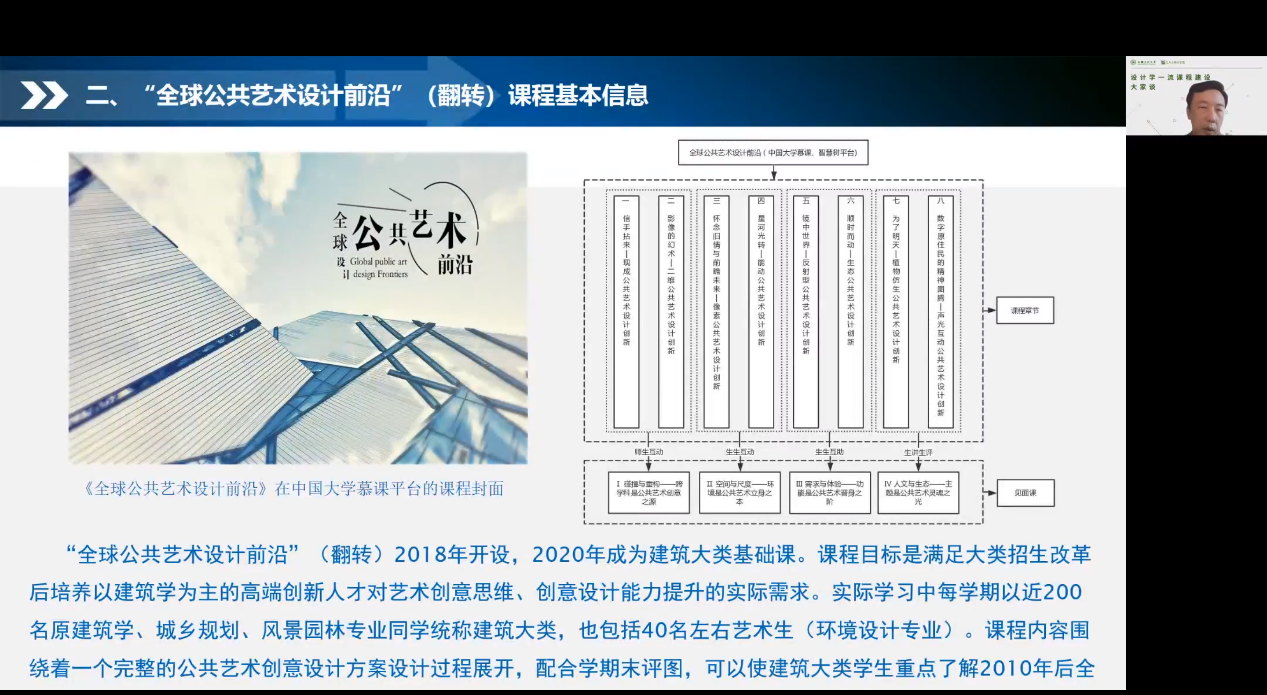 讲座分为三个部分,王震亚教授在《从慕课到金课:一流课程建设与申报》讲座中,分析了疫情下在线教育的痛点与机会,以国家一流课程建设规划为与会者详细讲解了国家一流课程中线上课程、线下课程、线上线下混合课程、社会实践课程与虚拟仿真课程的区别与各自申报要点,并结合自己多年教学经验,针对线上线下混合一流课程的建设、申报及评审等方面的内容与注意事项进行深入讲解与剖析。王鹤副教授在《设计教学中的课程思政》中结合自己教授的《全球公共艺术设计前沿》详细讲述了他如何将课程建设与课程思政深度融合,并结合课程教学中“建党百年与红色之旅”“抗击疫情与公共卫生”“扶贫助学与乡村振兴”等课程训练方向的具体做法与实践设计,详细展示了如何将教学资源、课程思政、实践训练与科学研究等进行系统化设计、建设。刘宗明教授在《艺术类专业学生“互联网+”创新创业大赛项目的培育经验分享与交流》从学生团队为什么要创新创业、学生团队如何践行创新创业、互联网+大赛评审要点为各位老师和同学讲解了如何做好比赛项目培育,并结合他指导的国赛银奖作品“便民卫视——无害化农村改厕新利器”展示了学生如何从前期找创意、找技术,比赛中如何完善竞赛方案、提高路演自信、夯实项目资料等,最终获得大赛好成绩的全过程。