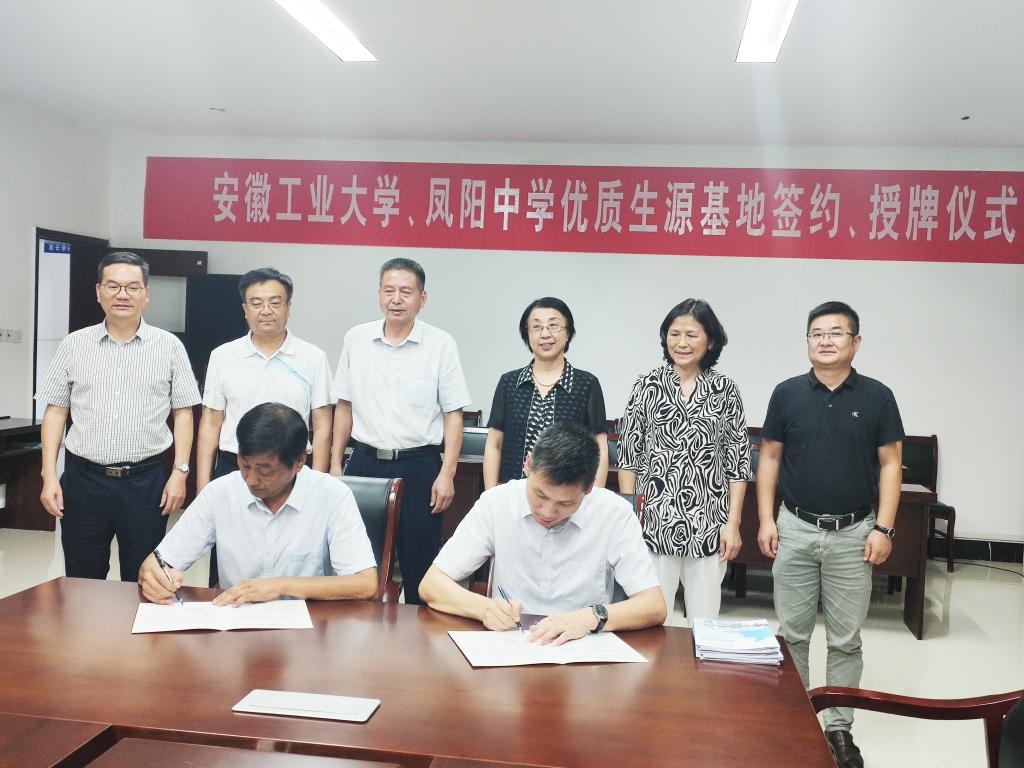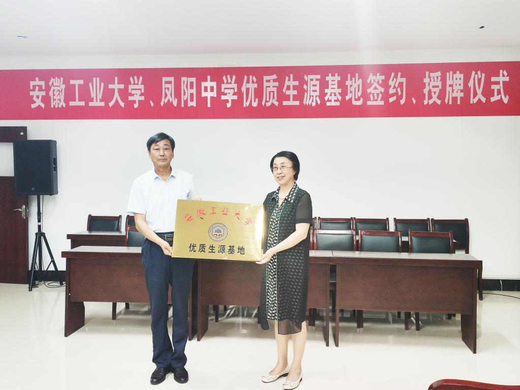 为进一步提升本科生源质量,加强大学与中学的联系、交流,促进高校选才和中学育才,6月28日,安徽工业大学党委常委、副校长顾明言等一行五人前往安徽凤阳中学举行优质生源基地签约授牌仪式。凤阳中学校长陈勋刚、校党总支书记王龙香、副校长高怀宝、万勇等全程陪同