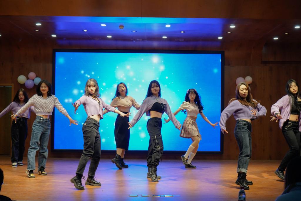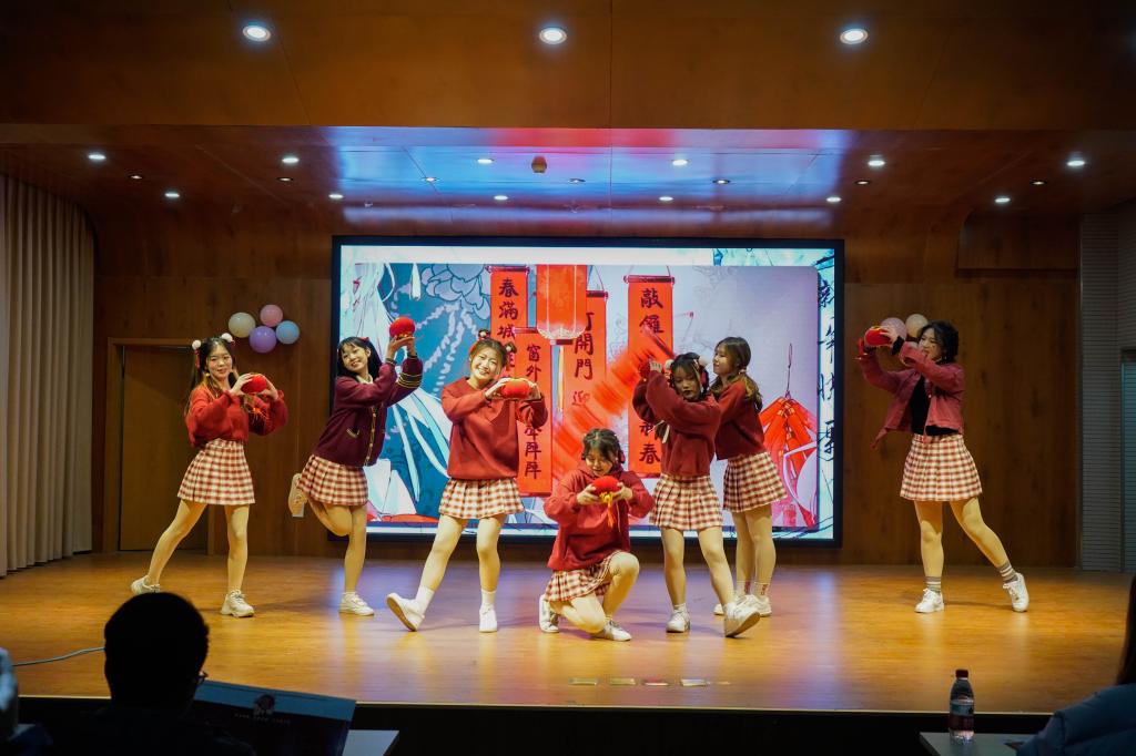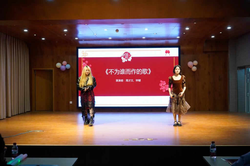 本次元旦晚会包含歌舞、话剧、脱口秀、小品等多种表演形式,节目新颖有趣、看点十足。晚会在喜庆可爱的开场舞《团团圆圆》中拉开序幕,姑娘们的青春活泼点燃了晚会的热闹氛围。歌曲《不为谁而作的歌》情感真挚动人,令人陶醉;幽默话剧《艰难抉择》无厘头式搞笑趣味十足。随后登场的小品《相亲记》、《四大才子》构思巧妙、妙趣横生,演员用生动的表情、肢体动作和滑稽的语言演绎着趣味闹剧,引得现场观众爆笑连连、掌声雷动,将晚会氛围推向高潮。暖心歌曲《old days Christmas》《pure》,舞蹈《追光》《save me save you》渲染了温馨轻松的节日气氛,使观众们深深沉醉在美妙的歌舞表演中。在脱口秀节目《成长》中,表演者将自己的真实经历汇编成有趣的包袱,语言诙谐幽默,引发同学们的共鸣。随后登台的舞蹈《solo》、《dolphin》又一次引爆全场。最后,赵颖老师倾情献唱歌曲《光》,祝福同学们在新的一年继续努力、拥抱梦想。