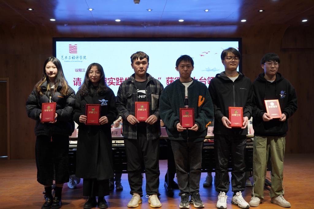 会议第二阶段,张辉对暑期社会实践成果进行总结报告,并对社会实践中各位同学的积极配合表示感谢。随后,刘慧洋宣读暑期实践先进个人表彰决定,大会进入颁奖环节,获奖同学分批次上台领奖并合影留念。大会最后,汪正指出本次表彰的目的是总结过去、展望未来,表彰先进、催人奋进,希望大家再接再厉共创艺设更好的明天。