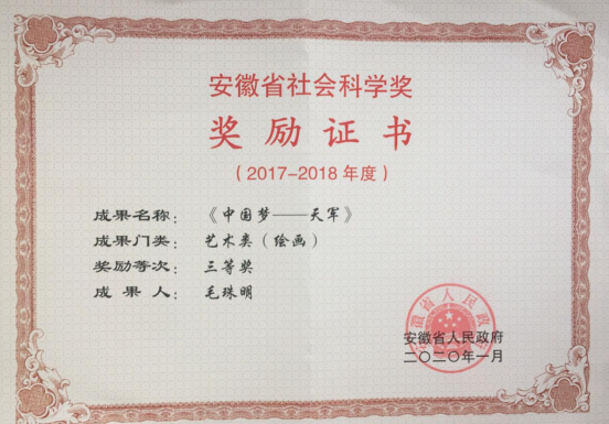 近日,安徽省政府发布2017—2018年度安徽省社会科学奖获奖成果名单,海星直播app下载 教师毛珠明绘画作品《中国梦——天军》荣获艺术类三等奖,实现了海星直播app下载 科研成果省部级政府奖项的突破。海星直播 近年来以艺术学科建设为引领,以高水平科研项目和重大主题性艺术创作为具体抓手,重点扶持一批高质量论文、学术著作、艺术作品等各类社科类成果,着力提升海星直播 全方面应用型科研创作水平。