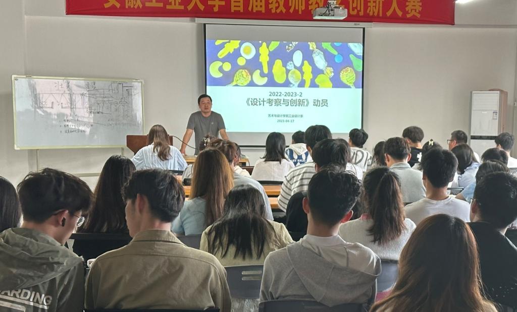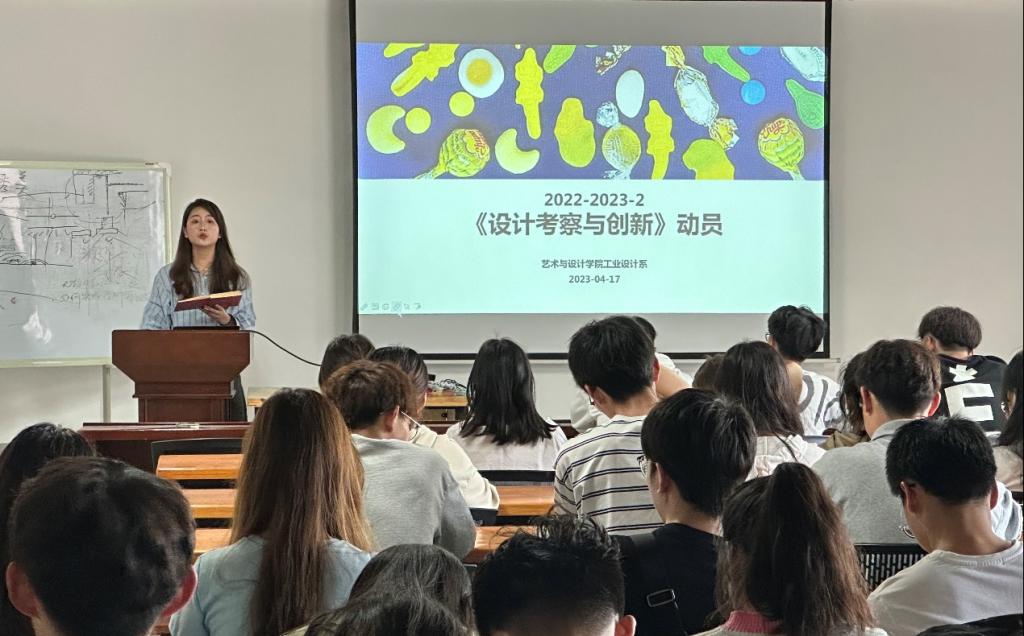 201教室召开课程外出动员大会。工业设计系党支部书记王乐琼、专业教师刘洋、张晴,2021级辅导员罗凡以及2021级工业设计专业全体学生参加动员会。