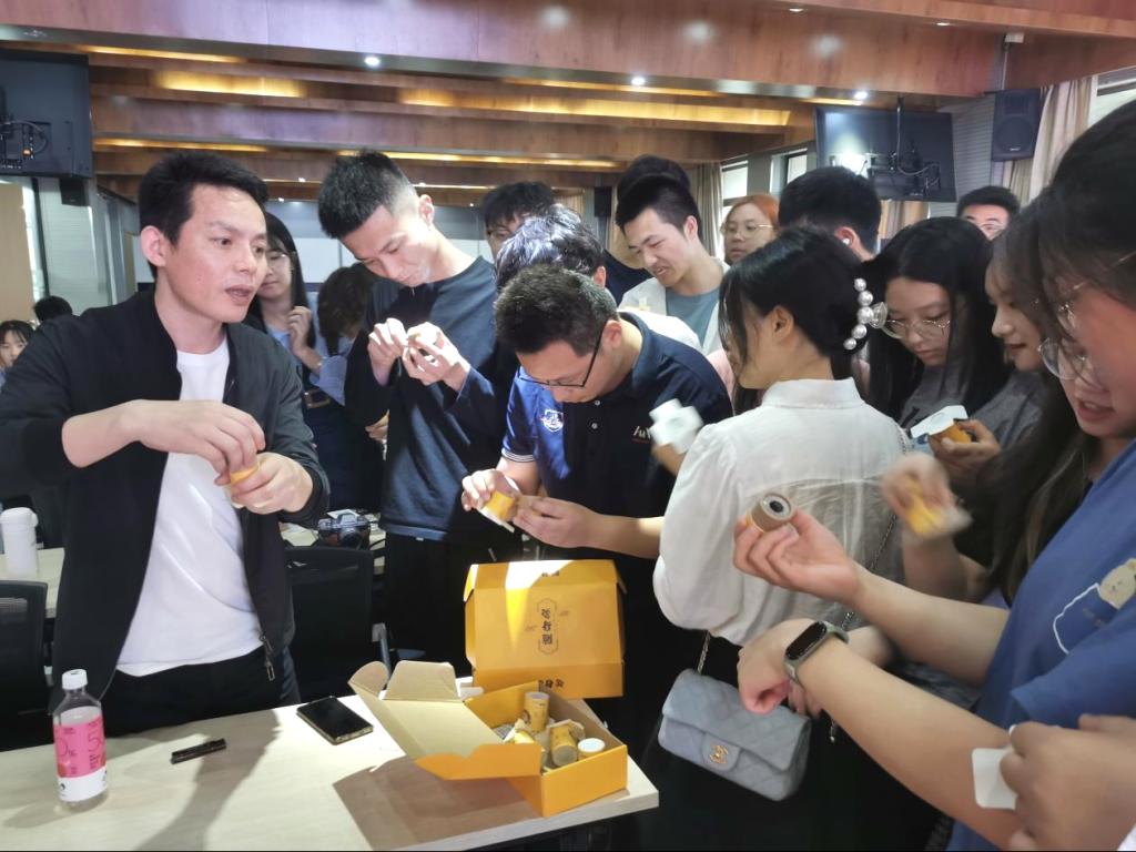 孙灿光总经理在《艾灸器具创新开发设计》讲座中,从艾灸的发展入题,介绍了艾灸的原理、益处与产业发展机遇。随后他从企业设计需求出发,为同学们详细讲解了现有随身灸产品、艾灸仪产品、熏灸仪产品等的使用方式、技术应用、设计痛点及用户需求,并结合同学们的疑问提供了多种设计思路,鼓励同学们积极思考,大胆创新。孙总也带来了企业目前的产品随身灸让同学们亲身体验。