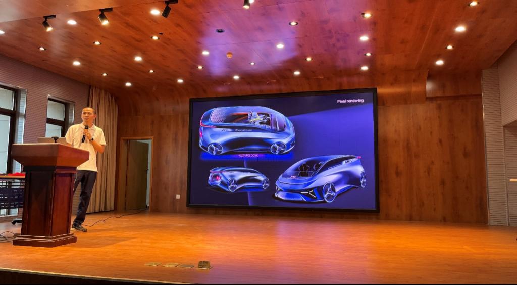 张乐乐主任在《破界—新能源浪潮下的汽车造型设计》的讲座中,从“品牌概述、赛事诉求解读、设计案例分析”三个方面展开讲述。他结合自身从业经历解读新能源汽车发展中的功能与美学,通过具体实例为同学们解析了以用户情感体验为中心的未来汽车设计趋势,结合个人设计的金奖作品《MKV-Smart Mobility System》、《基于新系统下偏远地区脑卒中远程急救车设计》生动形象地为同学们阐述了发现问题、用户分析、寻找答案、产出结果的设计流程。