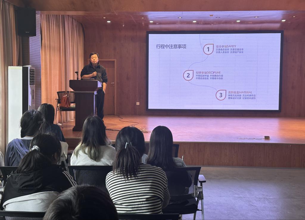 张晴老师首先对设计考察行程进行了解读,介绍了设计专题时间安排与课程具体任务,要求各位同学在考察中观察当地的人文环境、风情民俗、产品作品、工艺技法等,做好相关文化内涵、元素、符号等记录,回校后选择具有文化代表性的设计元素,从功能、形态、结构等方面进行生活用品的创新设计。