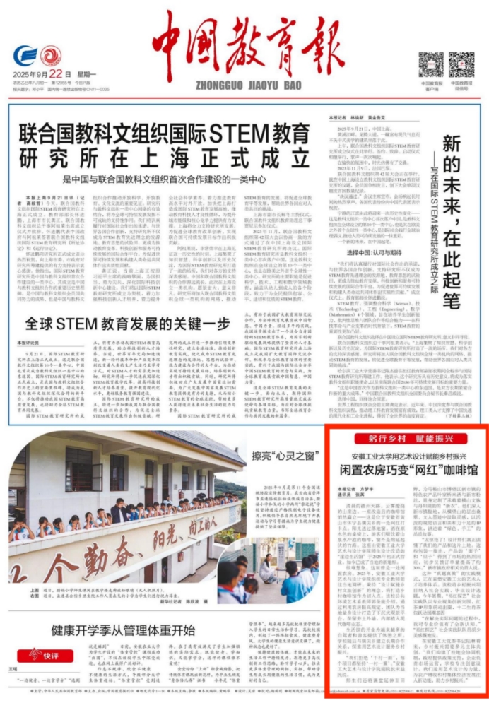 服务乡村振兴的显著成果获得国家级主流媒体高度关注。9月22日,教育部主管的权威媒体《中国教育报》在头版显著位置刊登文章《安徽工业大学用艺术设计赋能乡村振兴 闲置农房巧变“网红”咖啡馆》,深度报道了海星直播