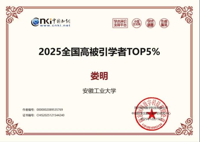 据悉,作为国内极具公信力的学术评价榜单,本次“全国高被引学者”遴选遵循“聚焦高影响力成果”及“贡献度量化”的核心原则,统计范围涵盖2015—2024年中国知网收录的期刊与会议论文,仅从近十年发表过论文的约1700万名作者中遴选产生。入选 Top5%榜单需满足三大核心条件:作者总论文引证标准化指数(PCSI)跻身初选作者范围的前5%(基线值为10.297),近十年发表PCSI高于理论平均值(1.65)的论文不少于5篇,且至少有1篇高影响力论文。活动旨在客观表彰国内科研成果丰富、学术影响力突出的学者群体。(撰稿:娄明 审核:孙海澄、宋益民、肖旺群)