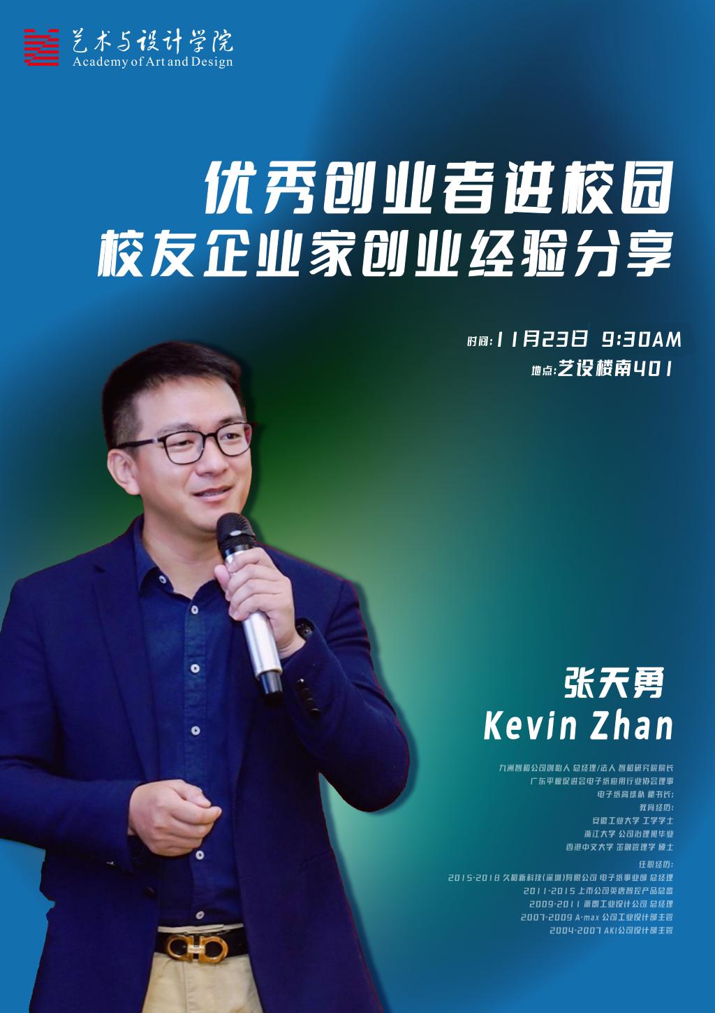 报告题目:优秀创业者进校园——校友企业家创业经验分享报告人:张天勇报告时间:2022年11月23日9:30报告地点:艺设楼401报告对象:海星直播 本科生、研究生报告人简介:张天勇,毕业于安徽工业大学工业设计专业,九洲智和公司创始人、总经理、法人,智和研究院院长 ,广东平板促进会电子纸应用行业协会理事,电子纸高球队秘书长。