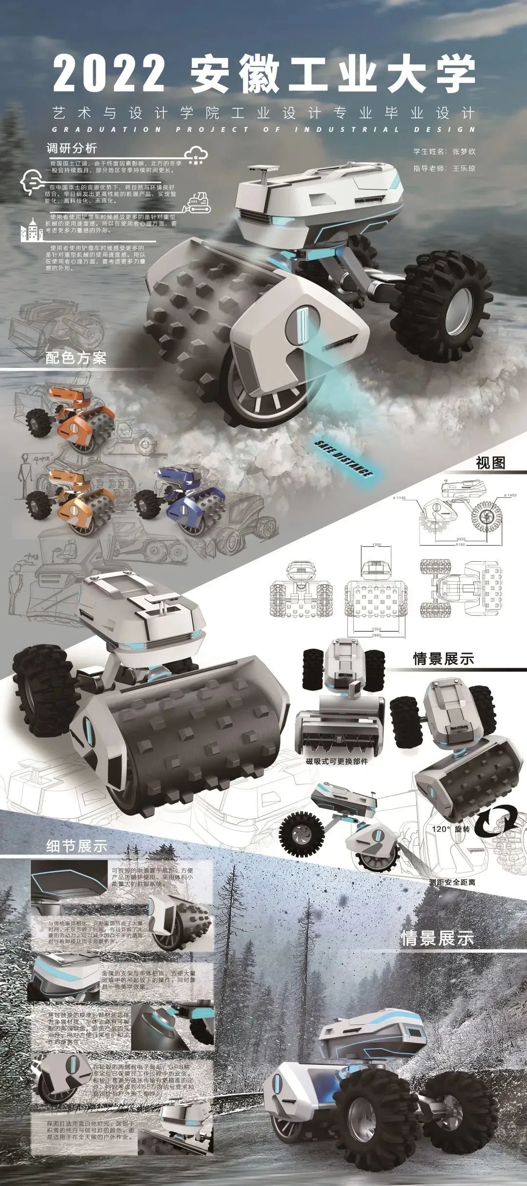 设计说明:这是一款在现有除雪原理上进行创新的概念性设计。结合我国独特的地域条件,进行针对性的功能拓展。体量的轻量化与智能一体化的最终方案是更具有代表性和创新。同时选用可拆卸的部件延长产品的生命周期,使得产品在城市维护中的角色更丰满。