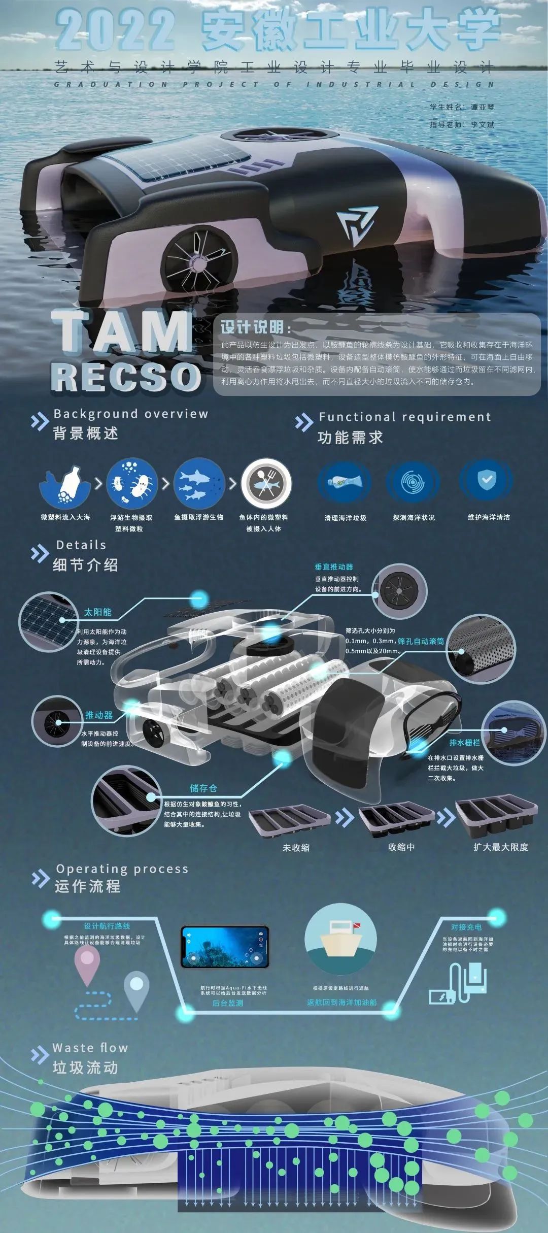 设计说明:此产品以仿生设计为出发点,以鮟鱇鱼的轮廓线条为设计基础,吸收和收集存在于海洋环境中的各种塑料垃圾包括微塑料,可在海面上自由移动,灵活吞食漂浮垃圾和杂质。设备内配备自动滚筒,使水能够通过而垃圾留在不同滤网内,利用离心力作用将水甩出去,而不同直径大小的垃圾流入不同的储存仓内。