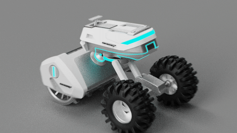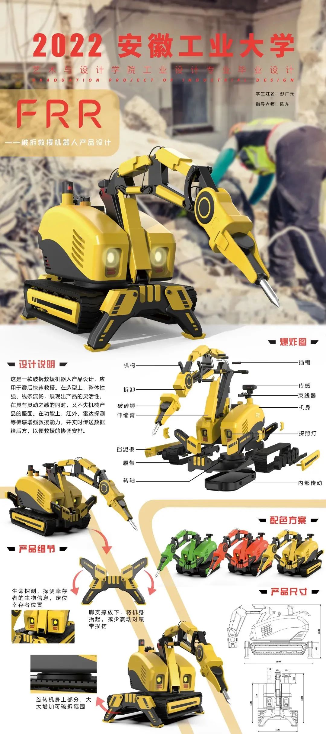 设计说明:本产品是一款适用于多种救援场所的消防机器人。其主功能以快速救援和灭火两个方向展开。前部分为液压破拆臂,后端配有旋转式水炮机,通过塔台可实现360°旋转。采用履带行进方式,车身搭载多种传感器可便于救援人员快速了解现场环境,以便快速救援。
