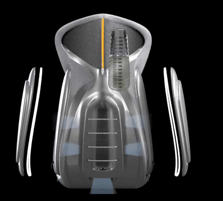 设计说明:这是一款多功能概念登山包,该背包具备能源供给系统,健康检测系统和喷气助力系统,同时改变了传统背包人机交互方式,并将指纹识别与可拆卸式定位器结合,增加了背包的可玩性和安全性,又可以为登山客提供多功能服务,进一步为登山之旅保驾护航。