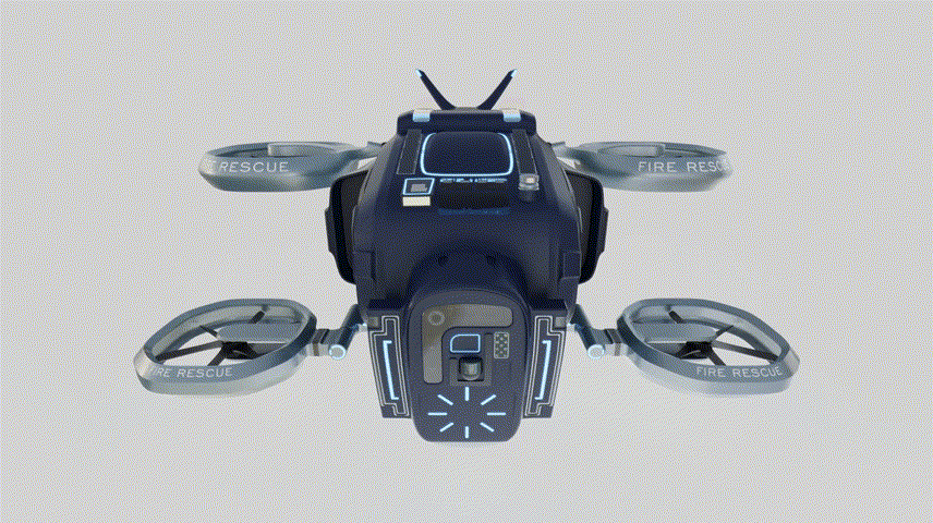 设计说明:这是一款能够针对高层建筑环境火情、能够快速抵达到达火灾发生点、辅助消防员作业的消防机器人。采用飞行器的基本架构,四驱动力布局,流线型机体,辅助高度集成传感器与图像设施。可根据警情地点自主规划最优路径,到达事故地点后,可提前侦查,收集数据信息向消防员反馈,为后续消防营救工作提前做好准备,提高消防员作业效率与安全系数。此外,这款产品还可担当消防运输设备,外挂大部分消防救援装备,减少高层建筑火情中装备运输时间长,运输效率低的痛点。