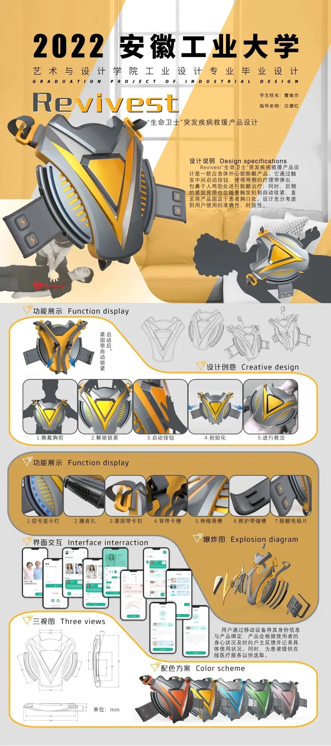 设计说明:Revivest“生命卫士”突发疾病救援产品设计是一款应急体外心脏除颤产品。它通过触发中间启动按钮,使得两侧的救护带弹出,包裹于人两肋处进行除颤治疗;同时,后侧的紧固背带也会随着触发机制自动收紧,直至将产品固定于患者胸口处。设计充分考虑到用户使用的准确性、时效性。
