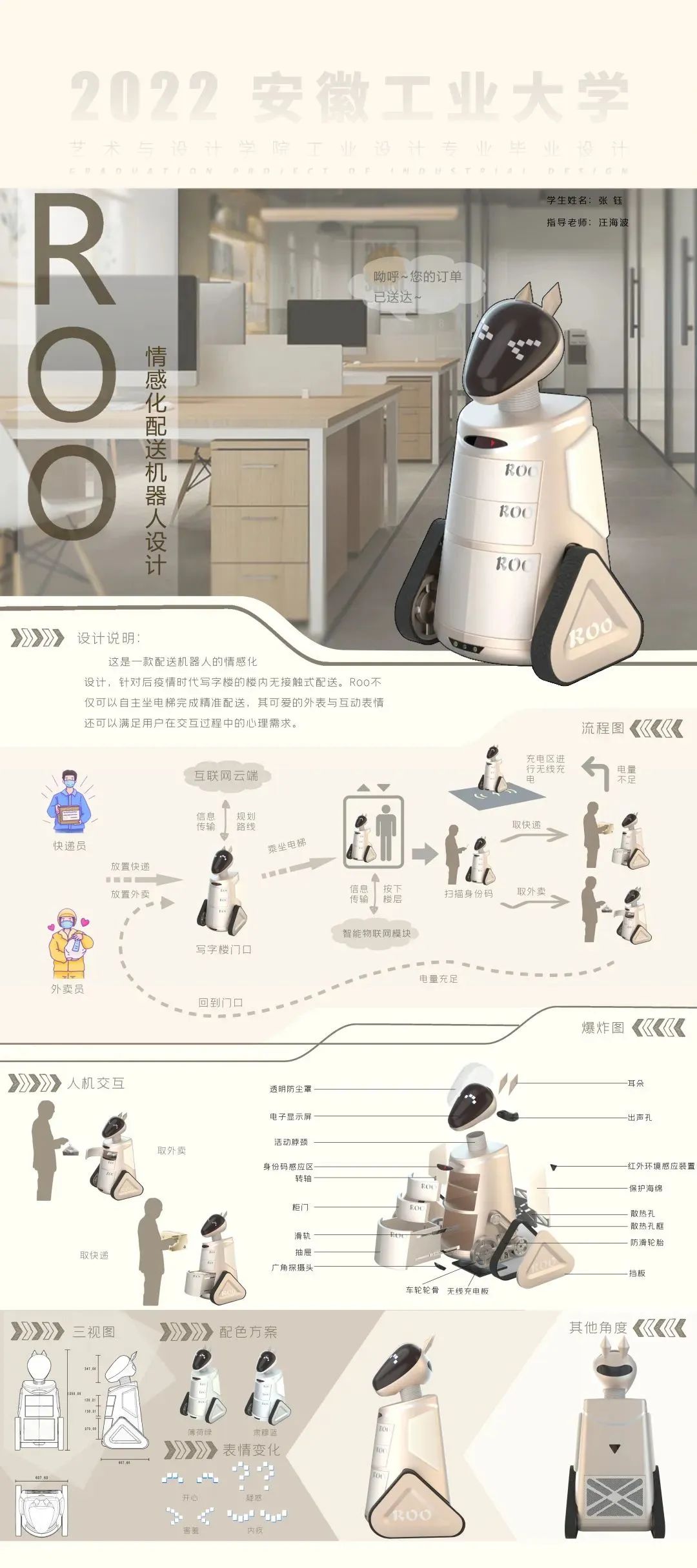 设计说明:这是一款配送机器人的情感化设计,针对后疫情时代写字楼的楼内无接触式配送。Roo不仅可以自主坐电梯完成精准配送,其可爱的外表与互动表情还可以满足用户在交互过程中的心理需求。