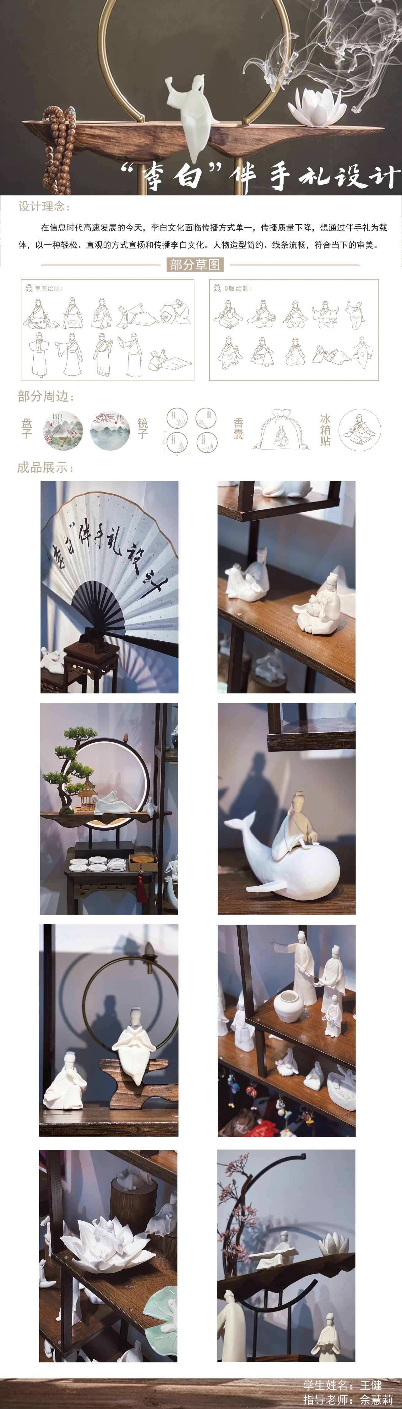 设计说明:在信息时代高速发展的今天,李白文化面临传播方式单一,传播质量下降。“李白”伴手礼设计根据李白性格、爱好以及所作诗词中提取李白钓鱼、看书、饮酒、乘舟、吹笛、作别等50个人物动态设计,其中还包含15个Q版人物形象,人物造型简约,线条流畅,符合当代人的审美。通过这种方式以一种轻松、直观的方式宣传和传播李白文化。