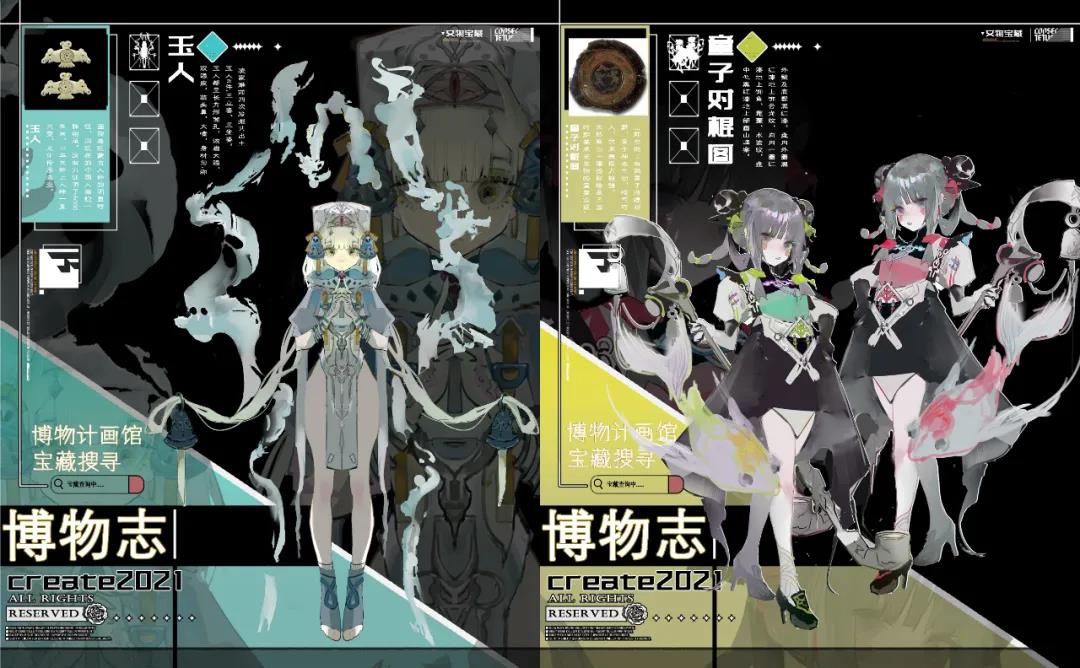 设计说明:通过把文物转换成游戏人物的方式,以达成用新媒体渠道用更容易传播和推广的形态把文化推向更高更广阔的平台的目的。从文物身上提取元素以及通过调查搜集大量的资料再结合文物本身的时代背景用途或者更深层次的文化内涵,把虚幻的内容无法直观转换成图像的内层意义可视觉化,以此为地基和标准,再以业内游戏需求审美衡量来设计人物。