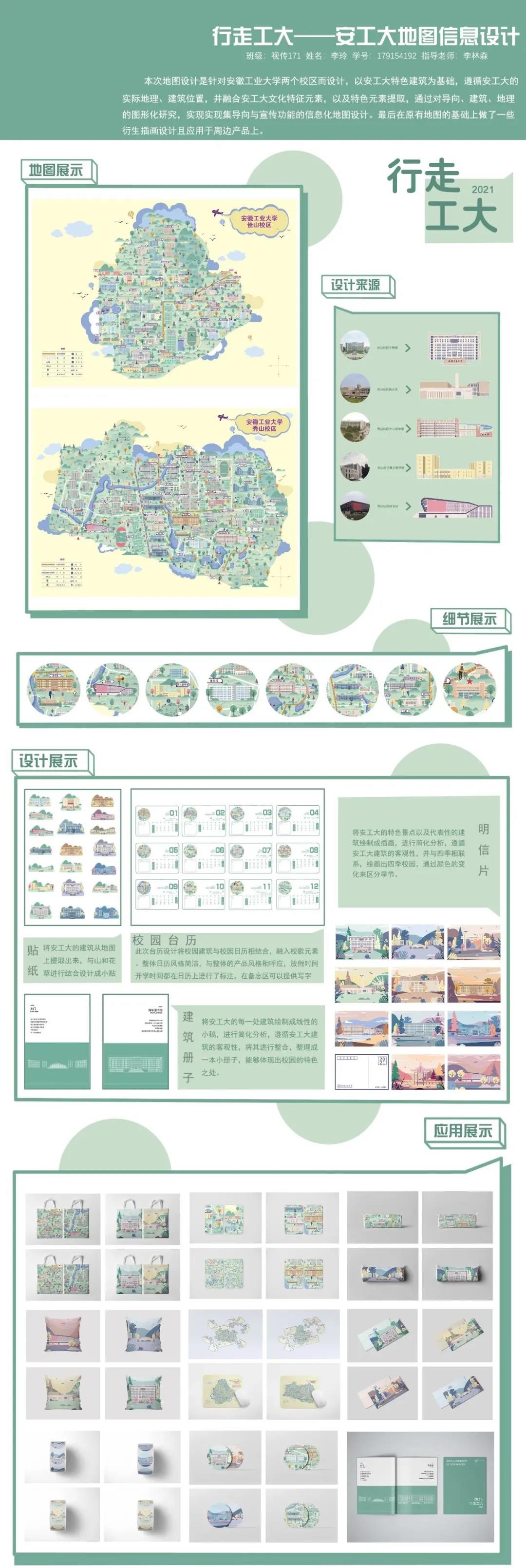 设计说明:本次地图设计是针对安徽工业大学两个校区而设计,以安工大特色建筑为基础,遵循安工大的实际地理、建筑位置,并融合安工大文化特征元素,以及特色元素提取,通过对导向、建筑、地理的图形化研究,实现实现集导向与宣传功能的信息化地图计。最后在原有地图的基础上做了一些衍生插画设计且应用于周边产品上。