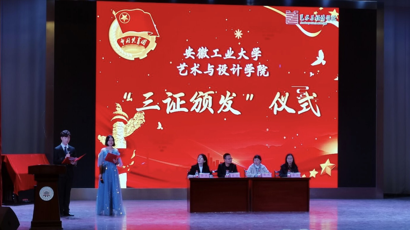 伴着激昂的团歌,“三证”颁发仪式正式开始。老生代表邓熙宁和新生代表吴润泽依次上台发言,阐述了作为团员的职责与义务,并呼吁同学们修身养德,提升自我,努力为团的建设添砖加瓦。接着,汪正对新团员表示祝愿与期盼,他希望共青团员们能够牢记使命,勇担责任,不断发扬中华民族传统美德,树立正确的人生观、世界观和价值观。最后,各年级辅导员为新生代表佩戴团徽,颁发团章和团员证。